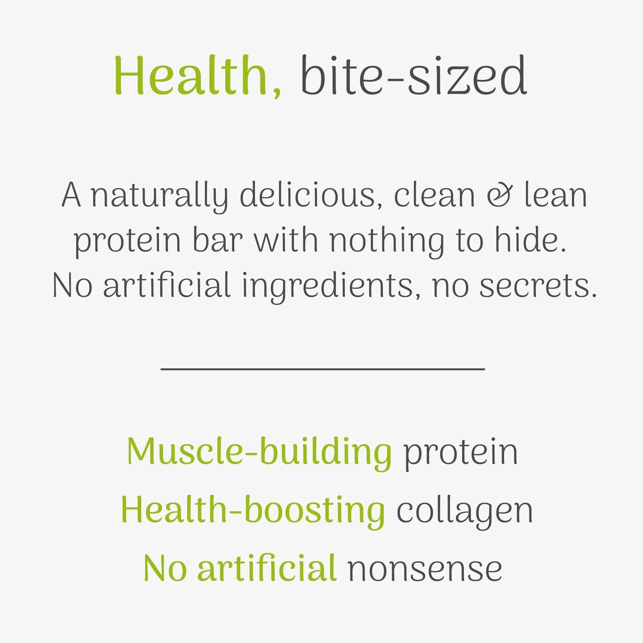 The naturally delicious protein bar with nothing to hide. No artificial ingredients; no hidden sugar alcohols; no secrets. Just ingredients found in kitchens, not in small print. Made by hand, sourced from nature for a full hit of 20g complete protein, 5g bovine collagen and 0g artificial nonsense.