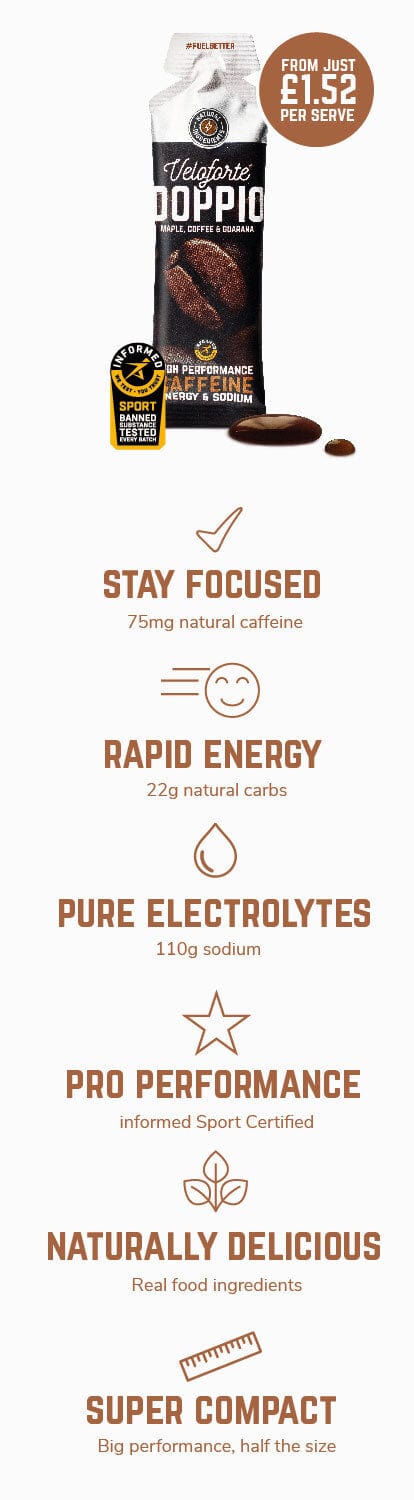 Naturally better, made with real fruit, Arabica coffee, maple, pure pink Himalayn salt and guarana, Doppio’s super streamlined pack provides the performance you expect without any synthetic additives, sugars or fillers.